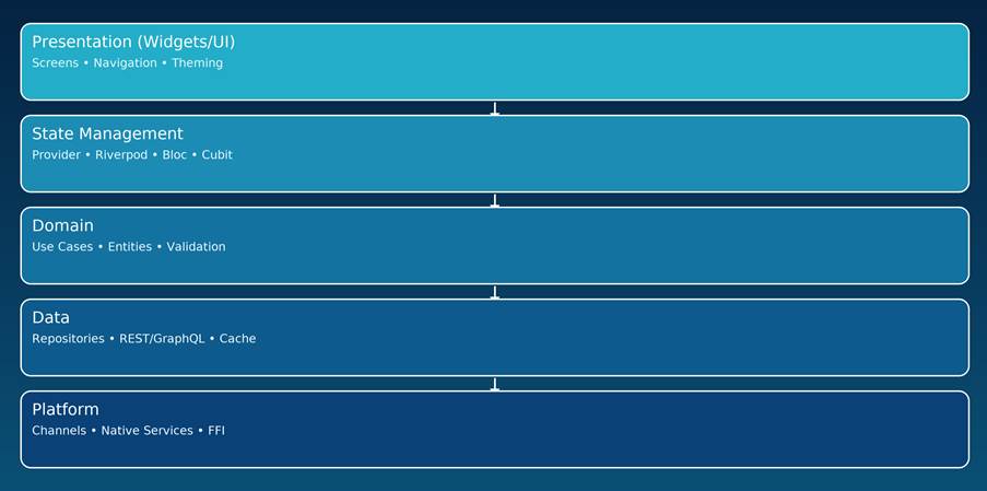 - State Management: Provider/Riverpod/Bloc/Cubit orchestrate app state.