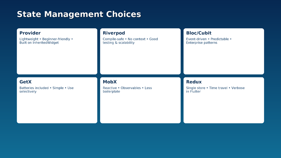 - GetX/MobX/Redux: Niche fits; weigh simplicity vs long-term clarity.